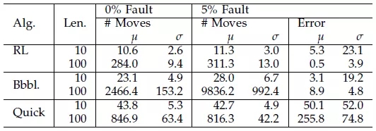 当数组存在错误时,实验中使用错误排序输出与正确排序输出间的欧氏距离衡量错误的大小。距离为零,表明算法返回了正确排序的数组。距离较大,表明算法结果与正确排序间存在较大的偏差。虽然相似性度量是一种衡量错误大小的理想特征向量,但是在正确排序数组未知的情况下,是不可能计算得到相似度的。在论文的实验中,作者考虑注入 5% 的错误率。结果表明,RL 排序算法的错误大小保持恒定,随数组规模发生较小变化,而标准偏差相对较高。冒泡排序具有同等的错误大学,但是对数组的更改次数则高出了数个量级。快排算法给出了数个量级高的错误大小。很明显,RL 排序算法对噪声具有韧性,并且更改数组的次数也是最少的。在更多数据集上的实验结果,参见论文原文附表。