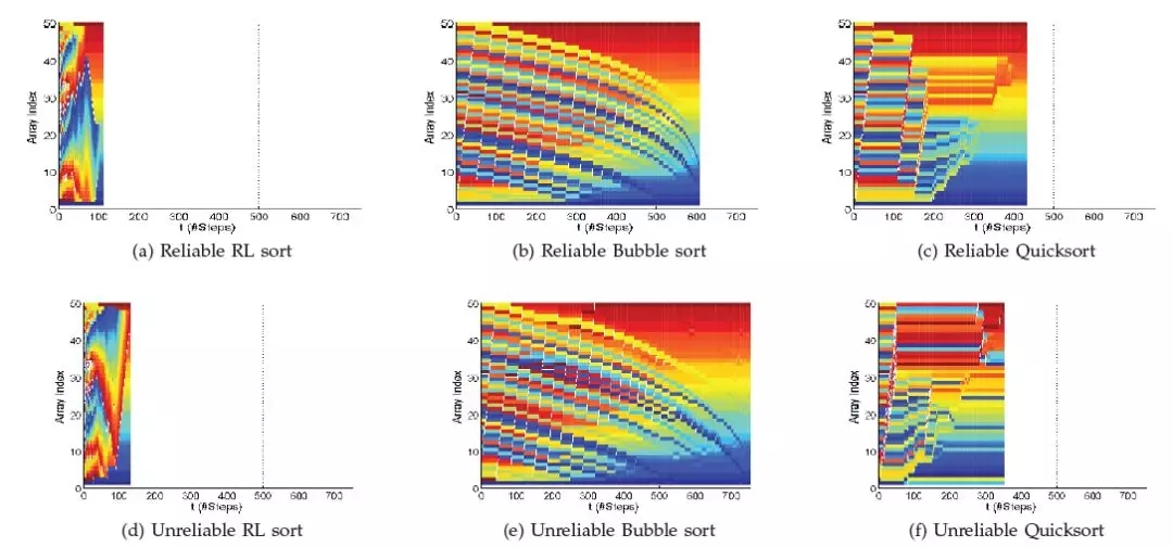 图一可视化地展示了在未引入错误条件下,RL 排序、快排和冒泡排序这三种算法在实现排序运算过程中数组的变化情况。三种算法分别需要执行 111(图 1a)、433(图 1b)和 608 步(图 1c)。冒泡排序算法对数组每次更改的范围较小,快排算法围绕锚点元素周围做大范围的元素移动。RL 排序算法(图 1a)利用了数据中的结构,将数组渐进地排序为逐渐增大的子数组。这是因为智能体在每一步都会降低近邻无序元素的数量。因此,RL 排序需要最少的数组操作。图 1d、图 1f 分别显示了同一数组在不可靠比较情况下的排序情况。当存在不可靠比较的情况下,RL 排序由于错误信息采用了不同的轨迹到达目标状态,即正确排序的数组。不正确信息影响了排序算法的本地选取,但由于算法的决策仅考虑本地信息,因此不影响给出正确排序的数组。而快排算法因为不再访问算法已排序的部分数组,因此会产生失败。这解释了表一中的高错误率的原因。
