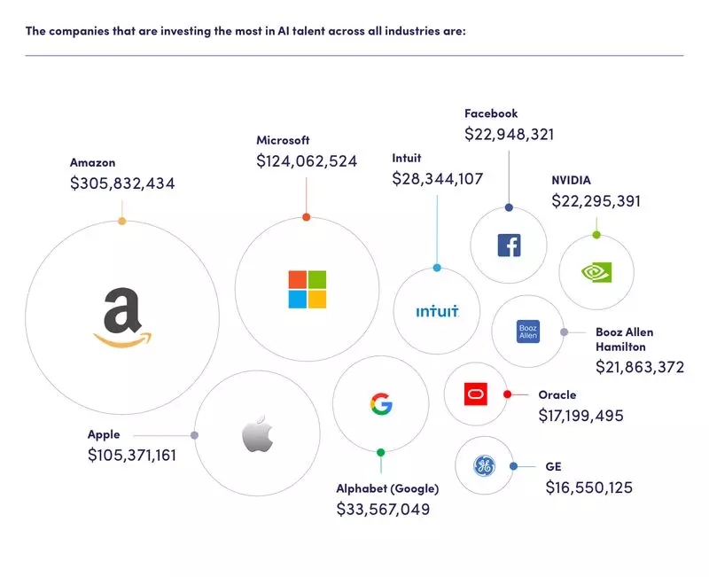 尽管技术寡头会用高薪和优先权留住他们现有的 AI 人才,研究表明他们也在积极招聘当中。机器学习编程领域的毕业生甚至在毕业之前就会得到很多工作机会。根据招聘平台 Paysa 的研究,美国各个领域的公司为 AI 人才投资了 13.5 亿美元。研究特别指出 Amazon 在 AI 和机器学习招聘方面的年平均投资为 2.278 亿美元,下一个主要竞争对手 Google 的年平均投资大约为 1.3 亿美元。据研究,排名前 20 的 AI 人才招聘公司每年需要投资 6.5 亿美元。