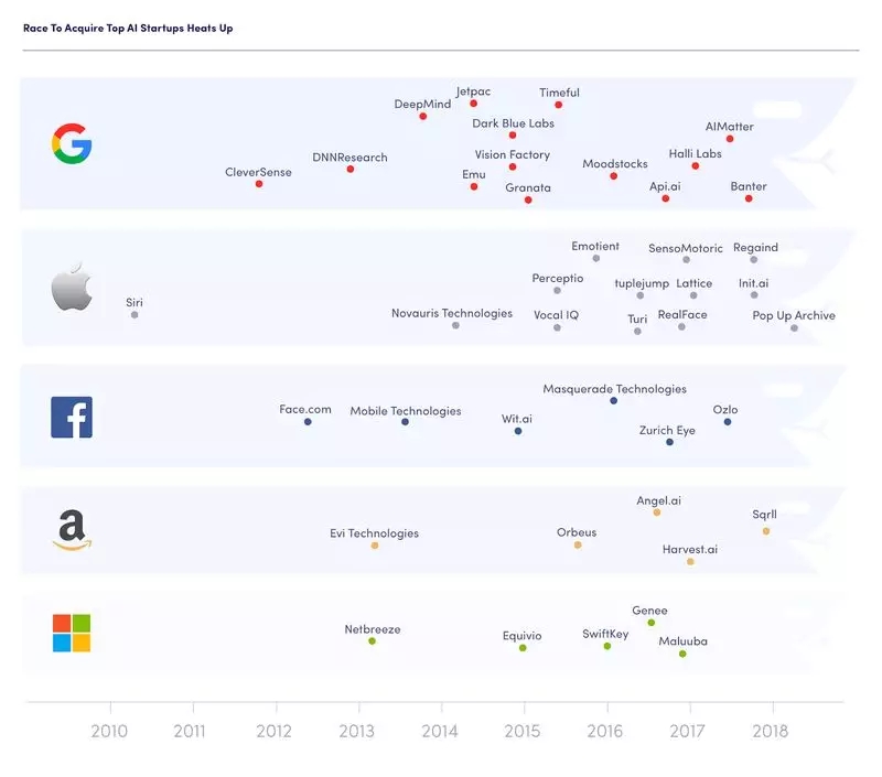 在 2016 年 7 月,General Motors 用接近 10 亿美元收购了 Cruise Automation。2016 年 8 月,Uber 以 6.8 亿美元的价格收购了自动驾驶初创公司 Otto。Ford 同意给 Argo AI 投资 10 亿美元。根据 CB Insights 提供的数据,从 2010 年开始,Google 收购了 14 家 AI 初创公司,紧随其后的 Apple 收购了 13 家。在 2017 年,AI 初创公司的收购增加了 44%。下图展示了最近几年 AI 初创公司的收购情况: