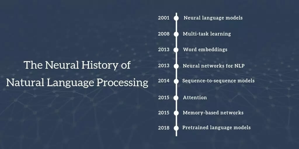 2013 年和 2014 年是 NLP 问题开始引入神经网络模型的时期。使用最广泛的三种主要的神经网络是:循环神经网络、卷积神经网络和递归神经网络。