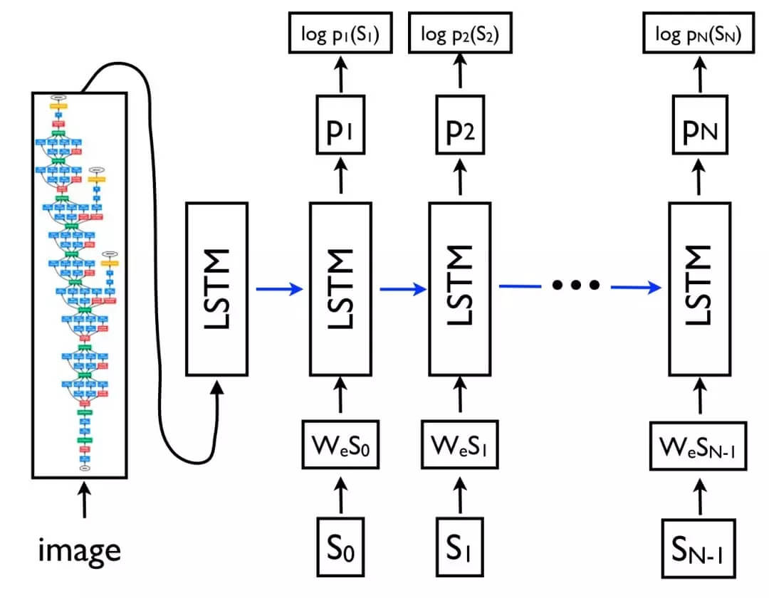 由于其灵活性,这个框架现在是自然语言生成任务的首选框架,其中不同的模型承担了编码器和解码器的角色。重要的是,解码器模型不仅可以解码一个序列,而且可以解码任意表征。例如,可以基于图像生成标题(Vinyals 等人, 2015)(如下图 9 所示)、基于表生成文本(Lebret 等人, 2016)和基于应用程序中源代码更改描述(Loyola 等人, 2017)。