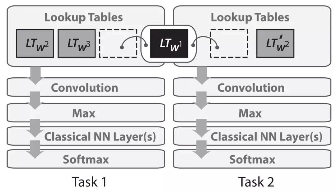 在 2008 年,Collobert 和 Weston 将多任务学习首次应用于 NLP 的神经网络。在他们的模型中,查询表(或单词嵌入矩阵)在两个接受不同任务训练的模型之间共享,如下面的图 2 所示。