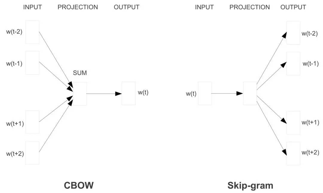 Word2vec 有两种风格,如下面的图 3 所示:连续字袋(CBOW)和 skip-gram。不过他们的目标不同:一个是根据周围的单词预测中心单词,而另一个则相反。