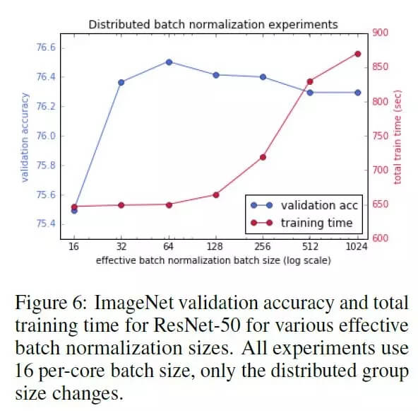 在分布式训练过程中,通常让每个计算节点独立的进行 batch norm, 这样的好处是可以大大缩短训练时间,因为每个计算节点之间无需额外的通信过程。在实验过程中,作者发现 BN 的批大小(例如计算节点的批大小)对模型的验证准确率有重要影响。已经有研究证明在计算节点的批大小小于 32 时,ResNet-50 的最终训练结果在验证数据上的准确率并不能收敛。