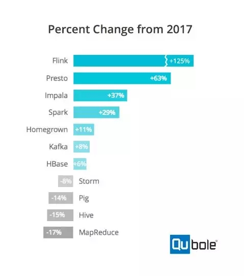 最近 Qubole 的一份调查报告显示,Apache Flink 是 2018 年大数据和 Hadoop 生态系统中发展最快的引擎,与 2017 年的类似调查相比,采用量增长了 125%。这种采用率的提升给人造成了一种很强烈的印象,Datanami 网站的两篇与 Flink 不相关的文章中都提到了它。其中一篇感叹大数据生态系统变得日益复杂,涉及的项目呈爆发式的增长,以及在应用场景中采用了错误技术所涉及的风险,但又不遗余力地说明了 Flink 在采用方面的惊人增长。另一篇有关 Cloudera Mike Olson 的文章讨论了这个领域从“动物园动物争吵”到解决企业问题的演变,但它仍然给 Flink 的采用量增长点了一个赞。有时候,动物园里最好的动物不一定是你所期望的那个。
