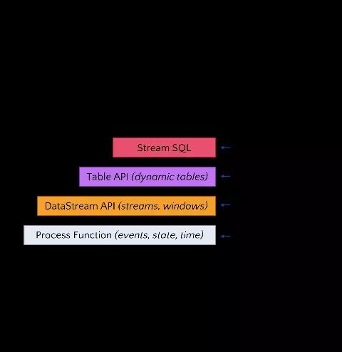 在使用 Hadoop 项目(如 MapReduce)多年之后,将流、状态、时间和快照的构造作为事件处理的构建块而不是键、值和执行阶段这些不完整的概念,这令人耳目一新。我的印象是 Flink 在接口以及这些接口如何与底层平台的功能相关联方面是最具表现力的。例如,SQL 接口支持滚动窗口和复杂事件处理。如下图的滚动时间窗口示例所示——几年前我们还很那做到这些——但现在却可以使用简单的 SQL 来表示。图中还显示了流式 API 和 processFunction 抽象级别的相似表现力。