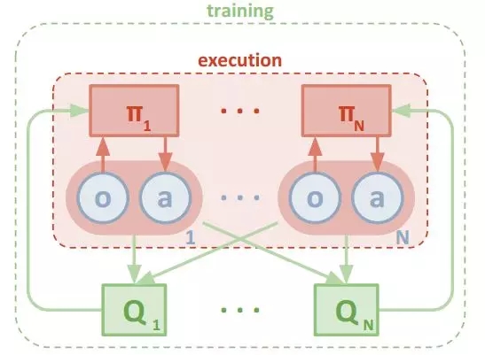 对于这些问题,其中一类解决办法就是利用中心化的价值函数(下图中的Q部分)为其他主体造成的影响建模,MA-DDPG,就属于这类方法。通过考虑其他主体的行为,个体的优势估计变换将会变得稳定。