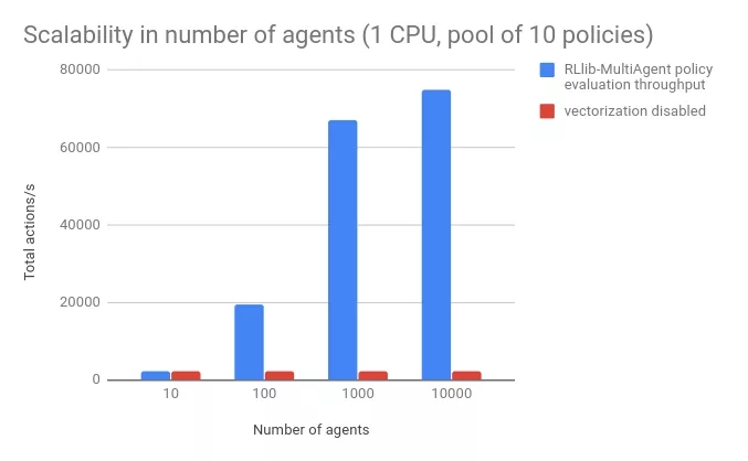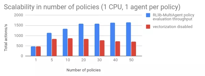 RLlib设计的初衷就在于大规模集群多主体的使用,但同时研究人员了为单核机器设计了较好的接口,是的小型电脑也可以有效地执行多主体APIs。下图展示了多主体策略的表现。其中基准是一个小型的浮点数适量,策略网络利用了16*16的小型全连接网络。并未每一个主体分配策略池中的策略。结果表明,RLlib在单CPU上,为单个环境中的1万个主体每秒管理7万次行动,当矢量化关闭时性能下降了近四十倍。