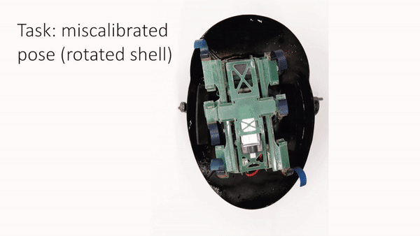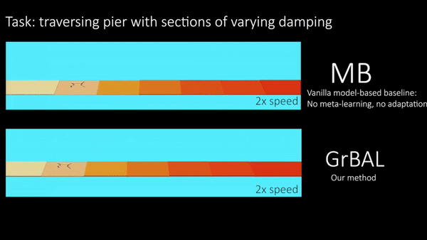为了测试这种方法对于环境突变的适应能力,研究人员首先在仿真机器人系统中进行了实验。研究人员在相同扰动下的环境中多所有主体进行了元训练,而在主体从未见过的环境及变化中进行测试。下面的猎豹模型在随机浮动的扰动上进行训练,随后在水上浮动的情况下进行了测试,机器人展现了快速适应环境变化的能力。右图显示了在断腿的情况下机器人的适应性: