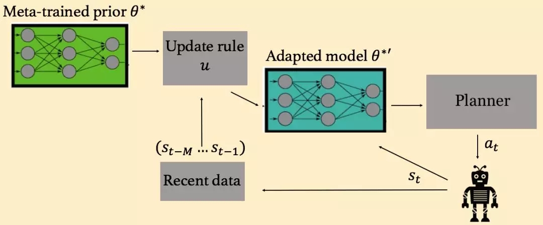 基于模型的元学习方法不像先前方法基于目标的奖励来优化,而是利用每一时刻预测与观测间的误差作为数据输入来处理模型。这种基于模型的方法使机器人在使用少量数据的情况下实现对环境的实时更新。