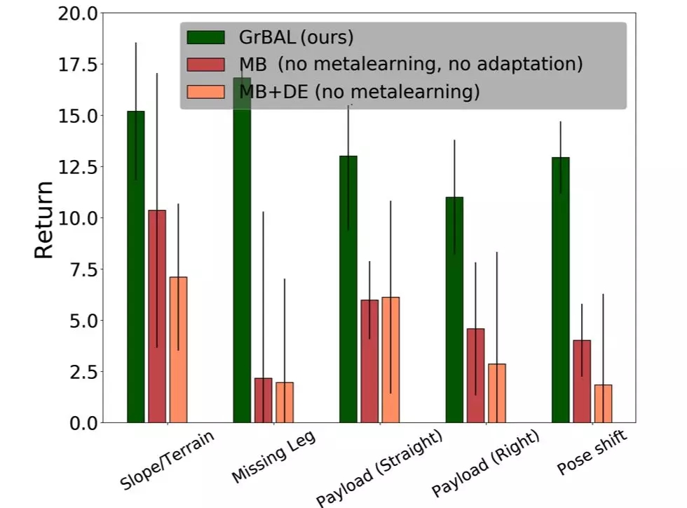 研究人员首先在不同的地面状况下对机器人进行元训练,随后测试了机器在新情况下的在线适应能力。在断腿、新地表、斜坡路况、负载变化、错误标定扰动等情况下都表现良好。可以看到不同情况下最右边的在线适应方法更为稳定,适应不同情况的能力更强。