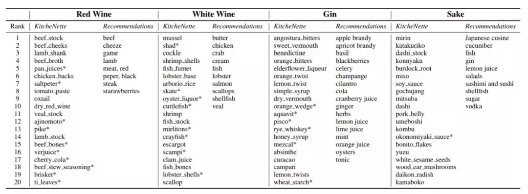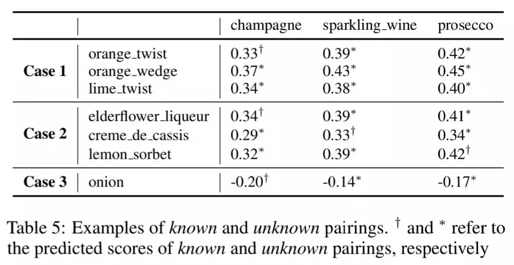 研究团队做了两个小实验来验证该模型究竟能否胜任。在第一个实验中,他们选择了三种类似的碳酸白葡萄酒——香槟,气泡酒,普罗赛克(如果不是专业的葡萄酒爱好者可能还真的有点分不清楚)。KitchenNette的任务是来计算与之搭配的食物所得的配对分数,即预测不同种类的白葡萄酒与某一种食物搭配口感如何。