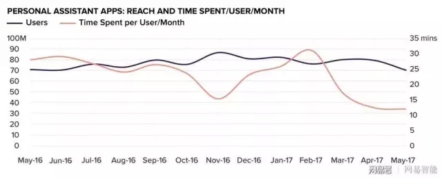 事实上,在过去的12个月里,消费者似乎在使用这类应用时花的时间更少了:虽然从总体上看,个人助理应用的平觉用户数量基本保持稳定,但每位用户的平均使用时间实际上在该段时间内呈下降趋势。