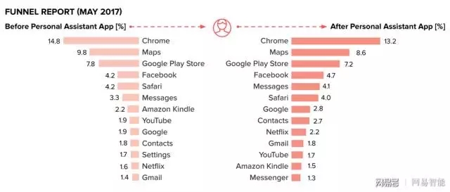 对个人助理应用的漏斗分析显示,在使用个人助理应用之前和之后,谷歌应用程序占据了消费者活动的主导地位:Chrome浏览器、谷歌地图和Google Play商店是在漏斗两端使用的三个主要应用程序。