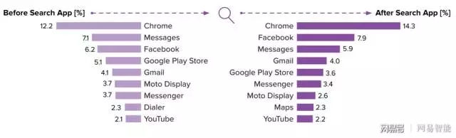 基于个人助理应用经常用于搜索信息的假设,我们还进行了第二个漏斗分析来对比,我们分析了用户在使用搜索应用或搜索网站之前和之后使用的应用程序。