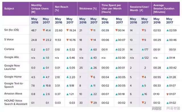 在2017年5月,Verto Analytics编制了首个个人助理应用程序指数,将从Siri到Alexa的一系列人工智能驱动的个人助理应用按照其受欢迎程度及进行了排名: