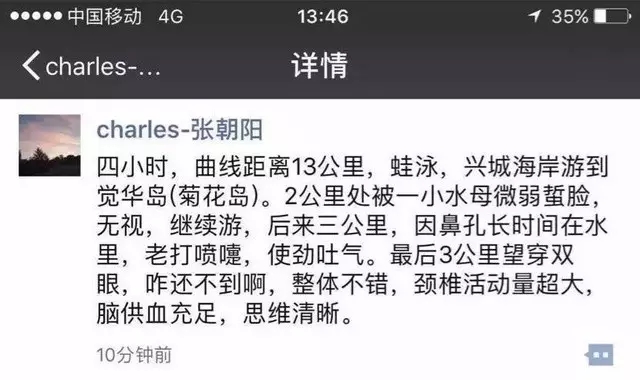 横渡过程中还有一个小细节,就是张朝阳游到大约2公里的时候,被小水母蛰了一下。他选择了无视,继续向前。