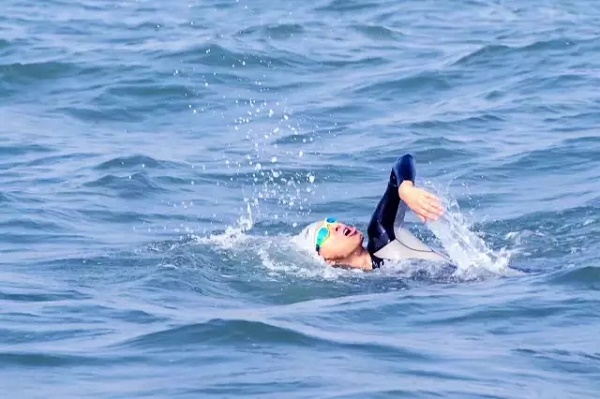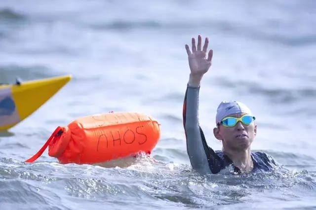 8点1分,张朝阳入水。12点13分,张朝阳出水,这意味着他成功横渡了兴城海峡,游距13.1公里。