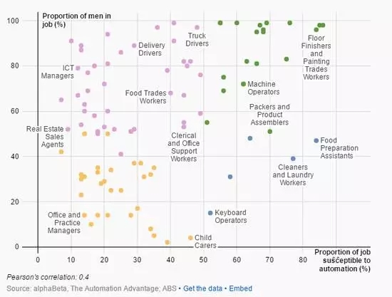 注:绿色-容易被自动化取代,主要由男性从事;蓝色-容易被自动化取代,主要由女性从事;粉红色-不易被自动化取代,主要由男性从事;橙色-不易被自动化取代,主要由女性从事。从上图可以看出,更容易被自动化取代的工作出现在右侧,而男性员工比例更高的工作更容易被取代。