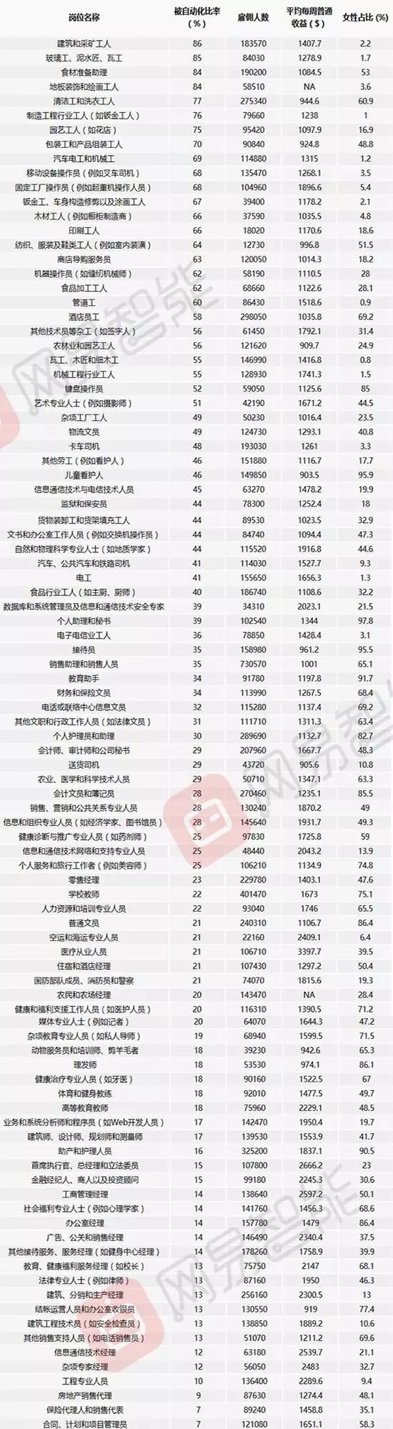 报告 | 100份工作大排名:你被自动化取代的概率是多少