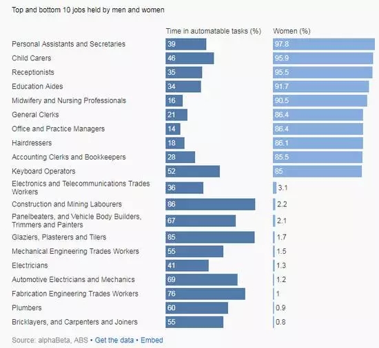 女性从事的工作不太容易被自动化技术取代: