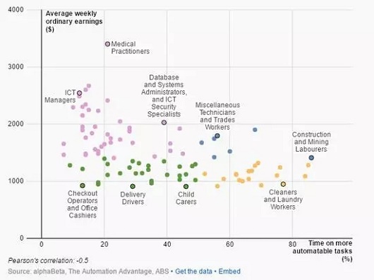 另一方面,经理、首席执行官和医生的工作中只有20%的部分是可以被自动化代替的,但这些工作在澳大利亚属于薪酬最高的职业(粉色圆点)。