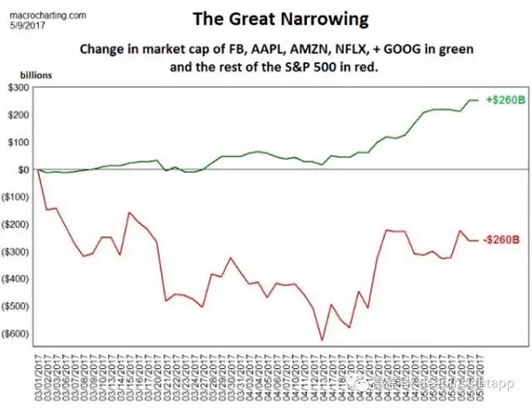 如同过去十年,全美零售行业的市值没有多大变化,但亚马逊一家增长的市场抵消了沃尔玛,百思买,梅西百货,JC Penny等实体零售下降的市值。