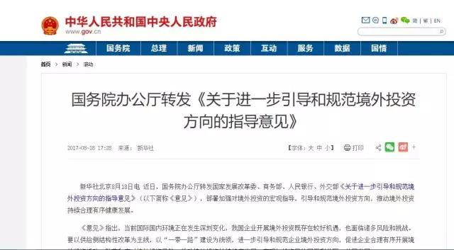 8月18日,国务院办公厅转发国家发展改革委、商务部、人民银行、外交部《关于进一步引导和规范境外投资方向的指导意见》(以下简称《意见》),部署加强对境外投资的宏观指导,引导和规范境外投资方向,推动境外投资持续合理有序健康发展。