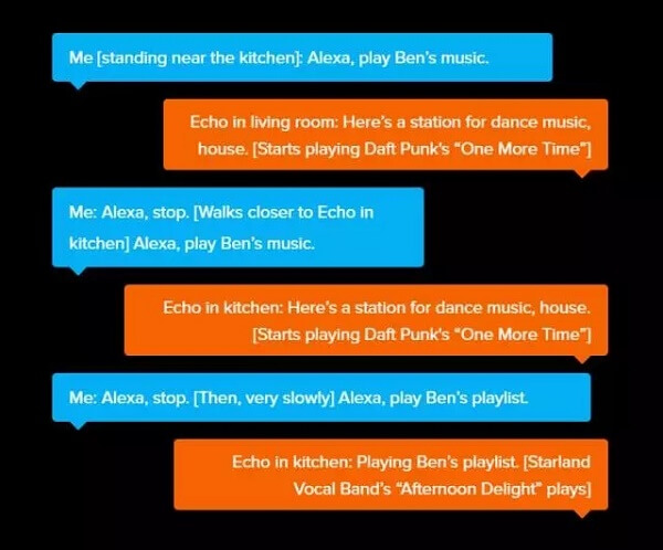 Rausch说:“Alexa将成为家里的一份子。”他的手臂越伸越长。“在我的家里,大多数地方都有Alexa,但不是每个角落都有,这太棒了。不过Alexa有时会误解我的意思,但这其实也挺好玩的,我们会像这样交流: