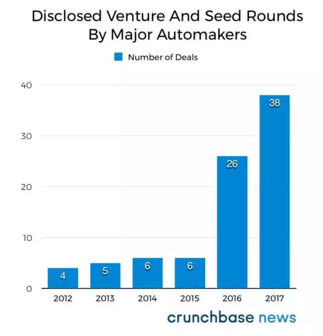 下面的图表显示了主要汽车制造商参与的风险投资和种子轮融资的数量。而这些数据仅仅是据透露的部分交易信息,因此实际投资和交易数量可能会更高一些。众所周知,为保证一定的竞争力,部分汽车制造商也会进行秘密交易。