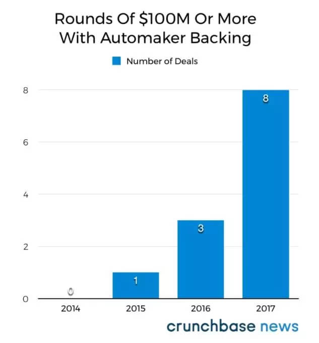 汽车供应商不仅仅在增加交易数量,还在不断提升投资数额。而截至目前,仅2017年汽车制造商已至少参与了八轮融资(融资金额高达1亿美元甚至更多)。而几年前,这一数字为零。下表展示了在过去五年里汽车制造商所参与的过亿美元融资次数。