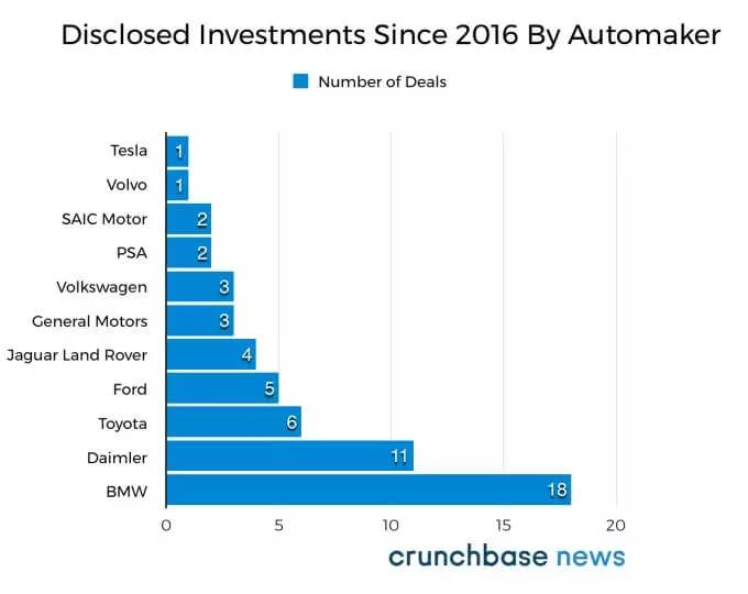 下图展示了自2016年以来主要汽车制造商所透露的投资数量:
