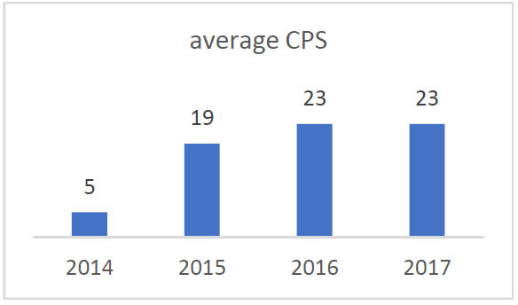 通过利用可延展的架构和基于学习的框架,小冰分别于 2015 年、2016 年在日本、美国发布,2017 年登陆印度与印度尼西亚。目前,小冰在全球拥有超过 1 亿不同的用户,与用户间的对话超过 300 亿回合。在过去 3 年中,小冰通过一系列技术迭代不断改进。图 13 总结了小冰在中国的用户粘性表现,测量标准是平均 CPS。结果显示,每轮对话平均包括 23 回合交流。