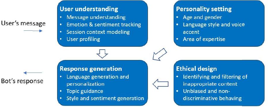 人际关系的生成:社交机器人必须展现足够多的社交技巧。因为用户可能有不同的背景、不同的个人兴趣和独特的需求,因此社交机器人必须能针对不同的用户生成个性化的对话。社交机器人需要生成情感上适当的回应、鼓励和激励,并满足用户的兴趣需求。它还需要引导对话主题,并管理人际间的关系,使用户感到有良好的理解并激发更多的交流。它同样还需要意识到不合适的信息,以免生成带偏见或冒犯用户的会话。
