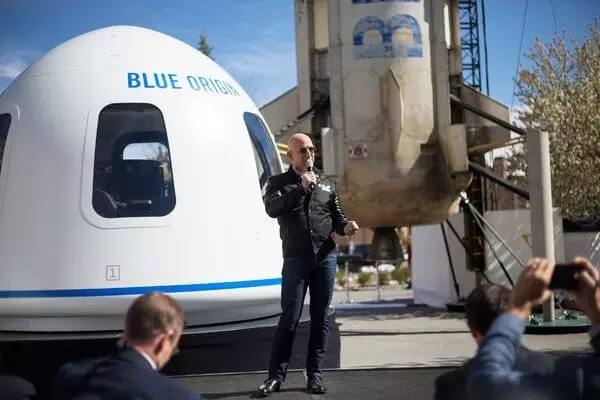 Bezos 在 Blue Origin 设计的可重复使用的太空飞行器前。Blue Origin 作为一家初创公司,扩大了 Bezos 的公众曝光度