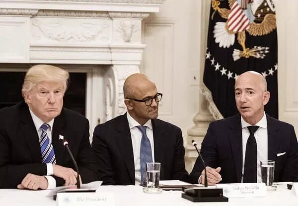 Bezos 在美国技术委员会的白宫会议上,与会者还包括特朗普总统和微软首席执行官 Satya Nadella