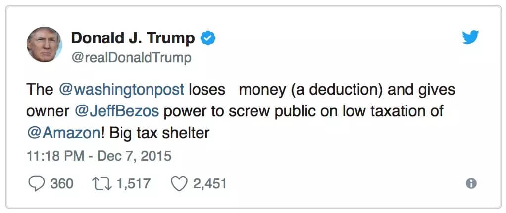 「《华盛顿邮报》通过不断地亏损让其所有者 Bezos 和亚马逊能够少缴税,这伤害了公众的利益。」当年 12 月份,川普又发推称亚马逊为「逃税者」。