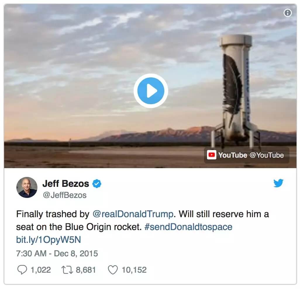 而 Bezos 的回应,是搬出 Blue Origin 火箭劝未来的美国总统「上天」。
