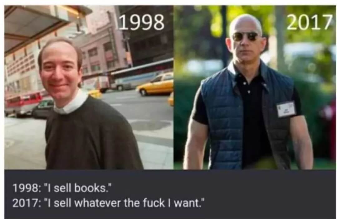 如果要用一幅图来刻画此刻的 Bezos 的话,用那张他 7 月份在爱达荷州参加一个商务会议时的照片再合适不过了。照片里 Bezos 两臂肌肉鼓鼓,撑起了 polo 衫。「硬汉 Bezos」迅速地成为了网络热图。一条推特把他 90 年代文文弱弱的照片(配文:在下卖书)和 17 年肌肉发达的形象(配文:老子想卖啥就卖啥)放在一起,形成了鲜明的对比。