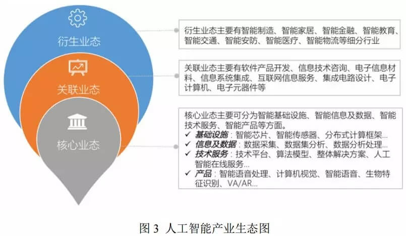 通过对人工智能产业分布进行梳理,提出了人工智能产业生态图,主要分为 核心业态、关联业态、衍生业态三个层次,如图 3 所示。