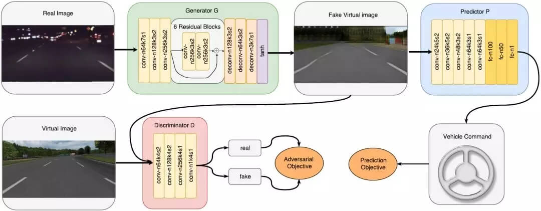 图 2:DU-Drive 的模型架构。其中生成器网络 G 将输入的真实图像变换成假的虚拟图像,然后预测器网络 P 根据这些虚拟图像预测车辆指令。判别器网络 D 的目标是区分假的虚拟图像和真实的虚拟图像。这里的对抗目标和预测目标都能促进生成器 G 生成最有助于预测任务的虚拟表征。为了简单起见,这里省略了实例归一化和每个卷积层/全连接层之后的激活层。(n 表示过滤器的数量,k 表示核大小,s 表示步幅大小)