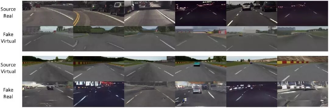 图 8:CycleGAN 的图像生成结果。上排:真实的源图像和生成的假虚拟图像。下排:虚拟的源图像和生成的假真实图像。