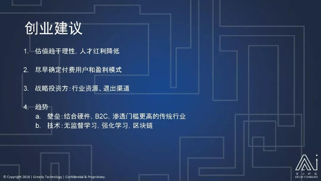 第一个就是 AI 公司现在估值应该会趋于理性,人才红利降低。2017 年有很多 AI 公司估值都非常高,我相信 2018 年应该也是这样,但相对来说估值会稍微理性一点,因为很多东西在风口上,它都有一个很狂热后逐渐冷却的过程,但是相对来说 AI 公司的估值还是非常高的,因为它的整个市场潜力非常大,我们预测它会更趋于理性一点。人才红利降低就是说以前你可能团队里有一两个 AI 很牛的人,你的公司的估值就会做得非常高,靠稀缺性人才就可能非常吸引资本,那么这样的一种红利可能会有所降低,就是说投资人也不只是看这一两个 AI 大牛,它还是要更关注公司的基本面,这是第一个建议。