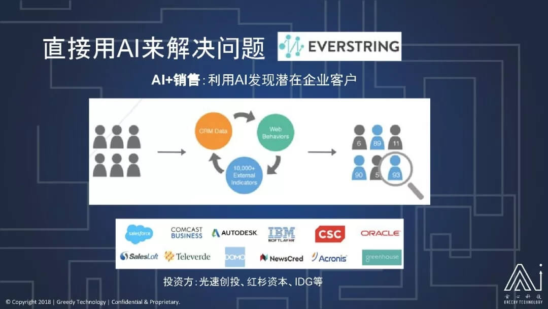 那 EverString 干的事情是当企业有一大堆潜在的客户时候,在我这张图上的这个左边,就是说这些灰色的人头,就是说每个人头可能都是个潜在的企业客户,那么你可能会有很多很多,比如说这个数以万计的潜在企业客户,你给一个企业过来,其实对企业来说,我要去跟这些客户聊,我要去销售,选择合适的企业客户来进行销售是很重要的,这个是很提高效率,减少销售人员的很多重复浪费工作,相当于提升他们效率,减少他们浪费很多时间在不太可能的客户上。