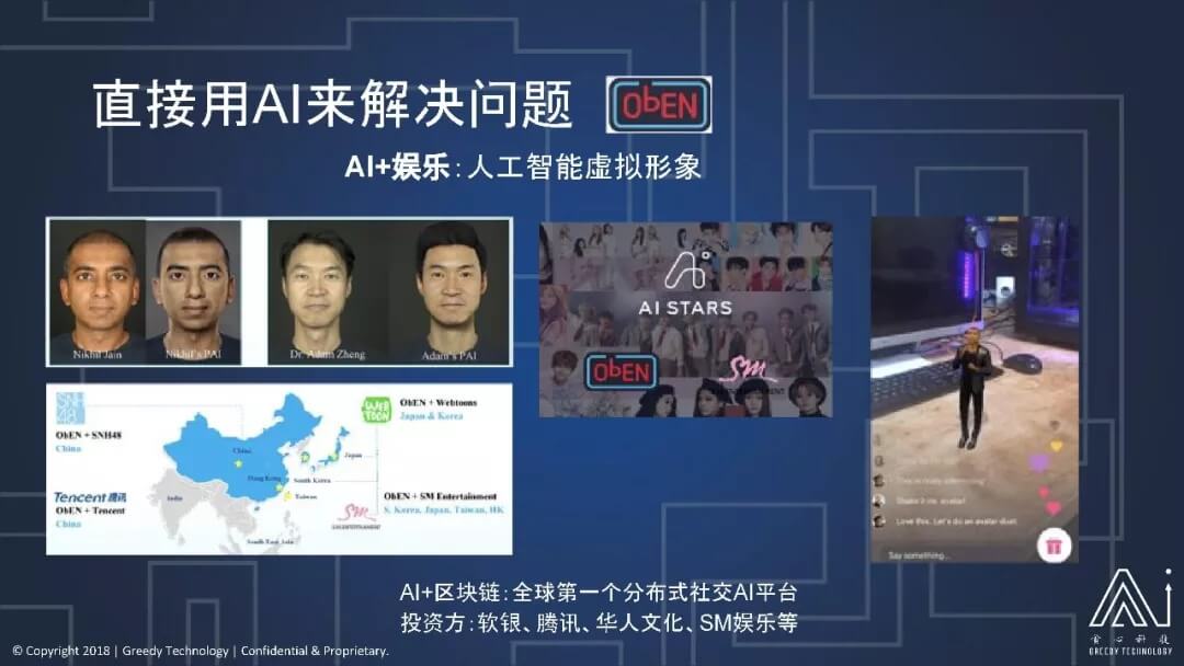 ObEN 的整个发展它也很快,除了和 SM 合作,比如说在中国它现在就在跟 SNH48 在合作。其他地方也有很多应用,包括它和微信等等这些企业也有合作。所以 ObEN 也是我讲的一家 AI 在垂直行业的应用公司,它在娱乐行业来进行运用,也是用 AI 来直接解决这个问题的。并且现在 ObEN,它在布局整个区块链,它推出了全球第一个分布式的社交 AI 的平台,结合了区块链。