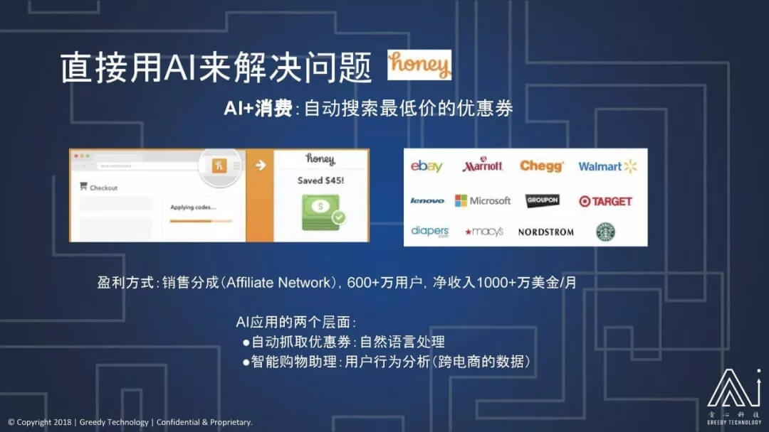 我要讲的下一家人工智能的公司叫 Honey。我这里的标题其实是有问题,Honey 不是我想讲的直接用 AI 来解决问题的公司,Honey 是我前面讲的 AI 公司当中第二类,它本身是个互联网公司,只是因为它获得了大量的数据之后,它自然的变成了一个 AI 公司,或者说它自然的就发挥了很多 AI 在这里面的功效。