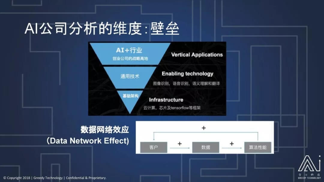 那么数据网络效应往往也是 AI 的公司的壁垒,我们经常讲:AI 公司先发优势很重要,你先进入这个市场,先获得数据你才能够不断的获取更多的数据、更多的客户。有的时候我们从投资角度来讲,AI 的数据壁垒往往已经超过了它技术的壁垒。