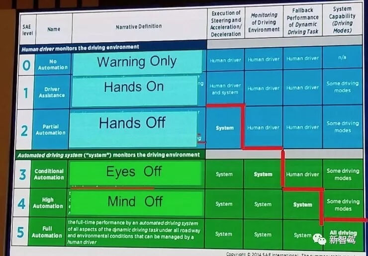 虽然这些系统暂时还不能实现自动驾驶,我们姑且称之为“半自动驾驶”,按照SAE的定义,这个阶段的“半自动驾驶”可以在特定场景下解放驾驶员的手和脚,但驾驶员的视线依然得紧盯前方路况。