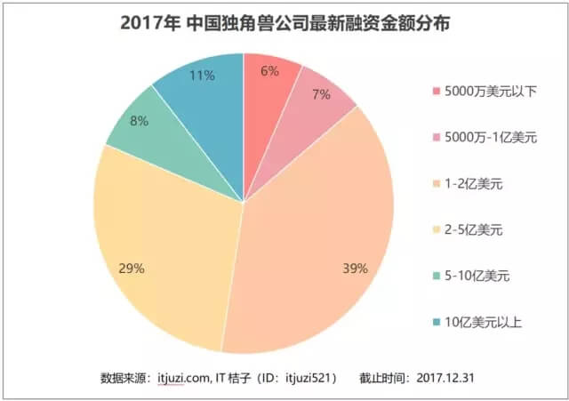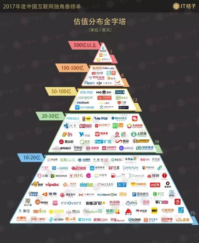 从《IT 桔子2017年度中国互联网“独角兽俱乐部”榜单》估值区间来看,我们将其细分为5个阶段,做出了如上的估值分布金字塔。